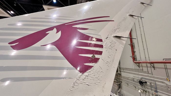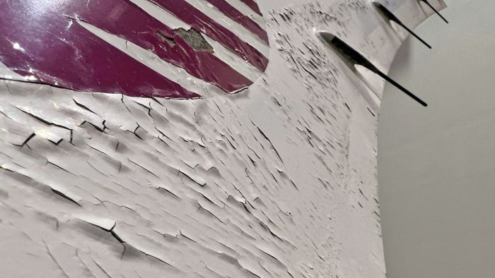 كما كان الطلاء الموجود على ذيل إحدى الطائرتَين والمزين بالشعار العنابي اللون لحيوان المها العربي الخاص بالخطوط الجوية القطرية مشققًا ومقشرًا ما تسبب في انكشاف الطبقة الموجودة بالأسفل.