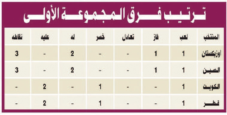 بتاريخِ 9 يناير 2011 نشرت الراية جدول ترتيب المجموعة الأولى، والتي تصدّر فيها منتخبُ أوزبكستان، حيث لعب مباراةً وفاز بها، وبالتالي في رصيده 3 نقاطٍ، ليحلَّ بعدَه المنتخبُ الصيني، حيث لعب أيضًا مباراة فاز بها، ولديه منها 3 نقاط، في حين جاءت قطر، والكويت تواليًا بعدما لعب كل منهما مباراة وخسرها.