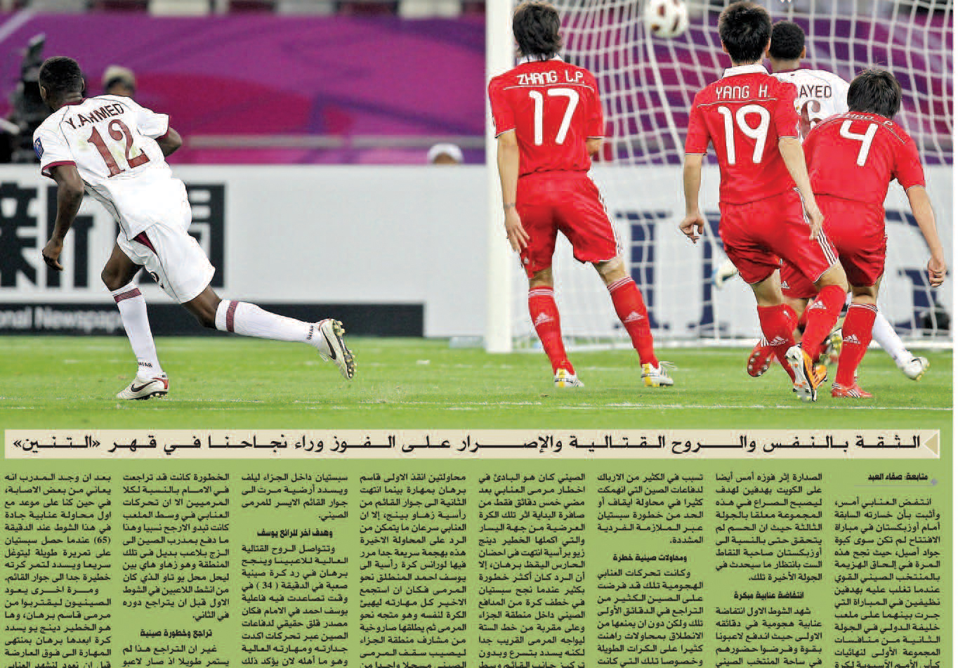 بتاريخِ 13 يناير 2011، نَشرت الراية تقريرًا عن فوزِ العنّابي على المُنتخب الصينيّ، حيث أثبتَ أنَّ خَسارته السّابقة أمامَ أوزبكستان في مُباراة الافتتاحِ لم تكنْ سوى كبوة جوادٍ أصيل، حيثُ نجحَ هذه المرَّة في إلحاق الهزيمة بالمُنتخب الصينيّ القوي عندما تغلّب عليه بهدفَين نظيفَين في المُباراة التي جرت بينهما على ملعب خليفة الدوليّ في الجولة الثانية من مُنافسات المجموعة الأولى لنهائيّات كأس الأمم الآسيويّة لكرة القدم، فقد أظهرَ العنّابي في مباراته هذه إمكاناتٍ متميزةً فعلًا، وخاضها بأعلى المعنويات، وبروح قتاليَّة جعلته الأرجح والأقدر فعلًا على حسمها بالشكل الذي انتهت إليه ليستعيدَ فرصتَه في التنافس من جديد على إحدى بطاقتَي المجموعة.