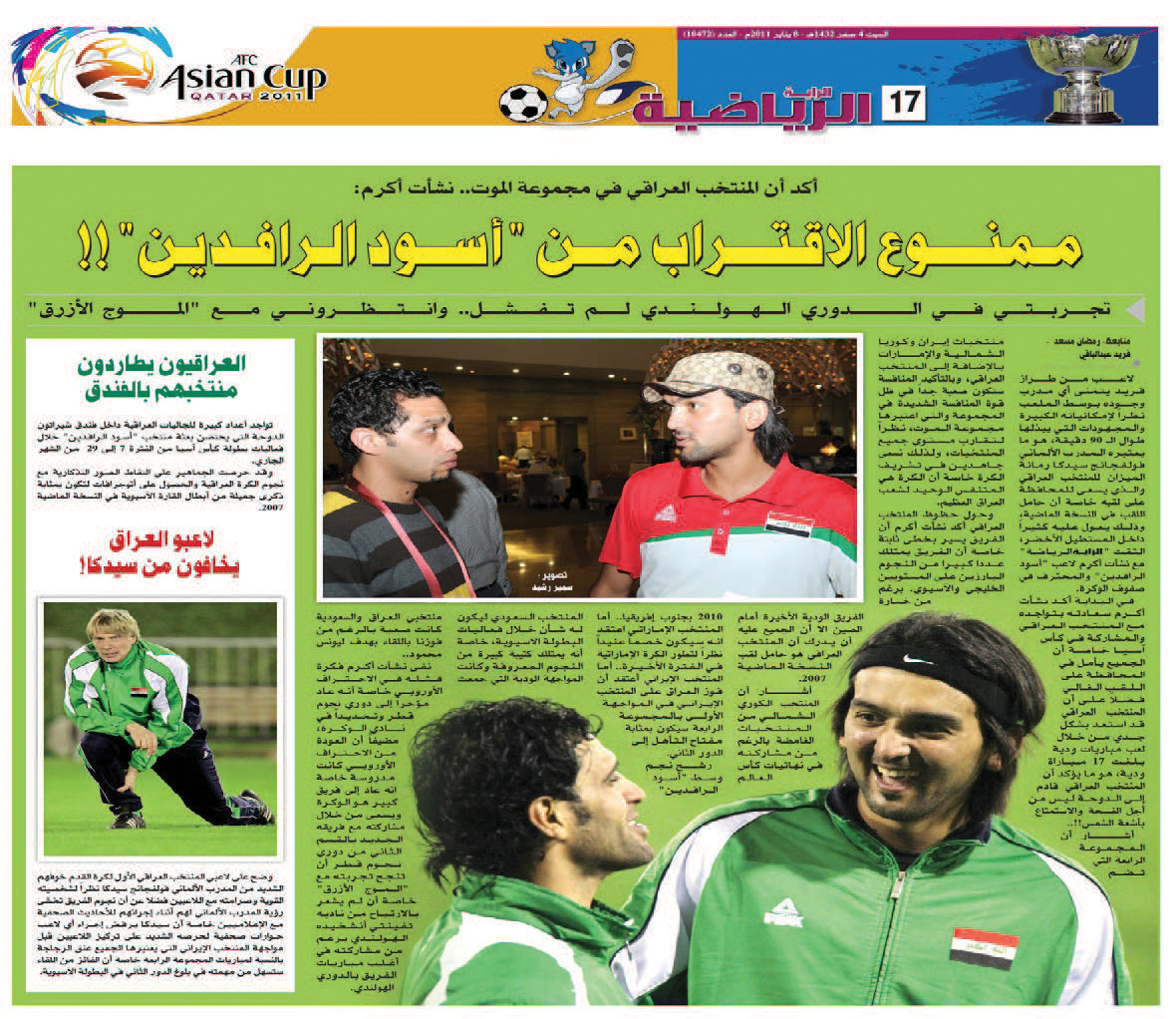 أجرت الراية حوارًا بتاريخِ 8 يناير 2011 مع لاعبِ منتخبِ العراق نشأت أكرم، وصفَ فيه المجموعةَ التي تضمُّ أسود الرافدين مع منتخبات: إيران، وكوريا الشمالية، والإمارات، بالإضافة إلى المنتخب العراقي، بأنَّها مجموعةُ الموت، حيث ستكونُ المنافسةُ صعبةً جدًا، نظرًا لتقارُب مُستوى جميعِ المنتخباتِ، ولذلك نسعى جاهدينَ لتشريفِ الكرة العراقيَّة، خاصةً أنَّ الكرةَ هي المتنفسُ الوحيد لشعبِ العراق العظيم.