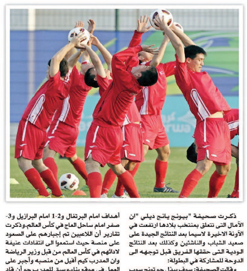 نَشَرت الراية بتاريخ 8 يناير 2011، تقريرًا نقلًا عن صحيفة «بيونج يانج ديلي « جاء فيه أنَّ الآمال التي تتعلق بمنتخب بلادها ارتفعت في الآونة الأخيرة، لاسيما بعد النتائج الجيّدة على صعيد الشباب والناشئين، وكذلكَ بعد النّتائج الوديّة التي حقّقها الفريقُ قبل توجّهه إلى الدوحةَ للمُشاركة في البطولة.