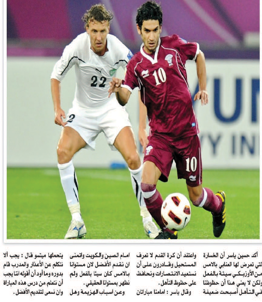 في عددِها الصَّادرِ بتاريخِ 8 يناير 2011 نشرت الراية تصريحاتٍ لنَجم العنابي حسين ياسر، أكَّدَ فيها أنَّ الخَسارة التي تعرض لها العنابي من الأوزبكي سيئة بالفعل، ولكن لا يعني هذا أن حظوظَنا في التأهل أصبحت ضعيفةً، وأعتقد أن كرة القدم لا تعرف المستحيل، وقادرون على أن نستعيد الانتصارات ونحافظ على حظوظ التأهل. وقالَ ياسر: أمامنا مباراتان أمام الصين والكويت، وأتمنَّى أن نقدم الأفضل؛ لأن مستوانا كان سيئًا بالفعل، ولم نظهر بمستوانا الحقيقي.