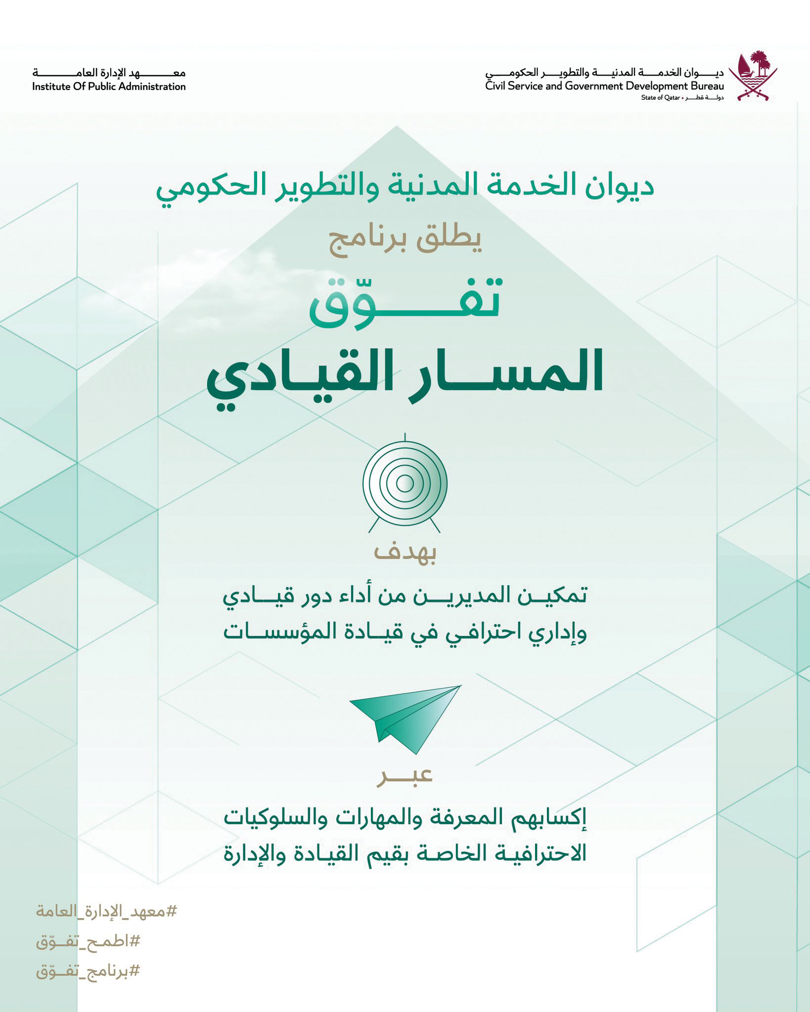 أطلق معهد الإدارة العامة في ديوان الخدمة المدنية والتطوير الحكومي أمس، برنامج «تفوق – المسار القيادي»، الذي يتضمن ورشًا تدريبية، ستعقد خلال الفترة من 28 أبريل الجاري إلى 6 يونيو المقبل. ويهدف البرنامج لتمكين المديرين من القيام بالدور القيادي والإداري والاحترافي في قيادة الجهات الحكومية، ما ينعكس ازدهارًا في القطاع العام الذي يشكل العنصر الرئيسي في تحقيق أهداف رؤية قطر الوطنية 2030.