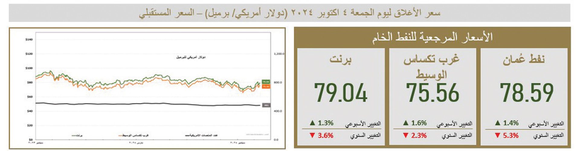 قالَ تقريرُ مؤسَّسة العطية: إن أسعار النفط الأسبوع الماضي ارتفعت بنسبة 1 %.. وأوضح التقرير أنَّ أسعار النفط استقرت على انخفاض يوم الجمعة، لكنها ارتفعت للأسبوع الثاني على التوالي، حيث قام المستثمرون بتقييم عوامل، مثل: الاضطرابات المحتملة في الإمدادات في الشرق الأوسط، وتأثير إعصار ميلتون في الطلب على الوقود في فلوريدا. واستقرت العقود الآجلة لخام برنت على انخفاض 36 سنتًا، أو 0.45%، عند 79.04 دولار للبرميل. واستقرت العقود الآجلة لخام غرب تكساس الوسيط الأمريكي على انخفاض 29 سنتًا، أو 0.38%، عند 75.56 دولار للبرميل. ومع ذلك، ارتفع كلا الخامين القياسيين خلال الأسبوع بأكثر من 1%.
