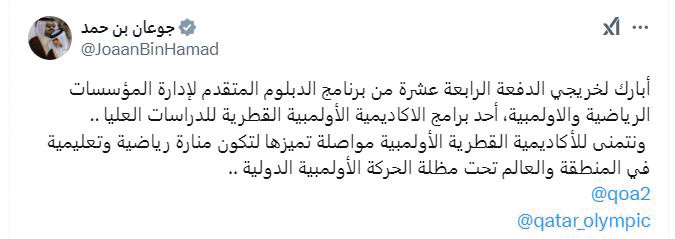 باركَ سعادةُ الشَّيخ جوعان بن حمد آل ثاني، رئيس اللجنة الأولمبيَّة لخريجي برنامج الدبلوم المتقدم لإدارة المؤسسات الرياضية والأولمبية، وقالَ عبر حسابه على منصّة «X»: أباركُ لخريجي الدفعة الرابعة عشرة من بَرنامج الدبلوم المتقدم لإدارة المؤسسات الرياضية والأولمبية، أحد برامج الأكاديمية الأولمبية القطرية للدراسات العُليا.. ونتمنَّى للأكاديمية القطرية الأولمبية مواصلة تميّزها لتكون منارةً رياضيةً وتعليميةً في المِنطقة والعالم تحت مظلة الحركة الأولمبية الدولية.